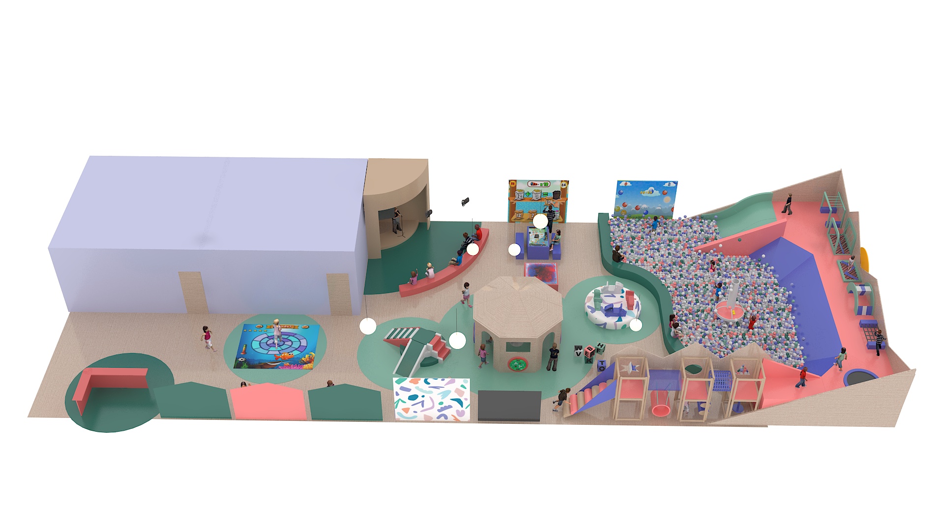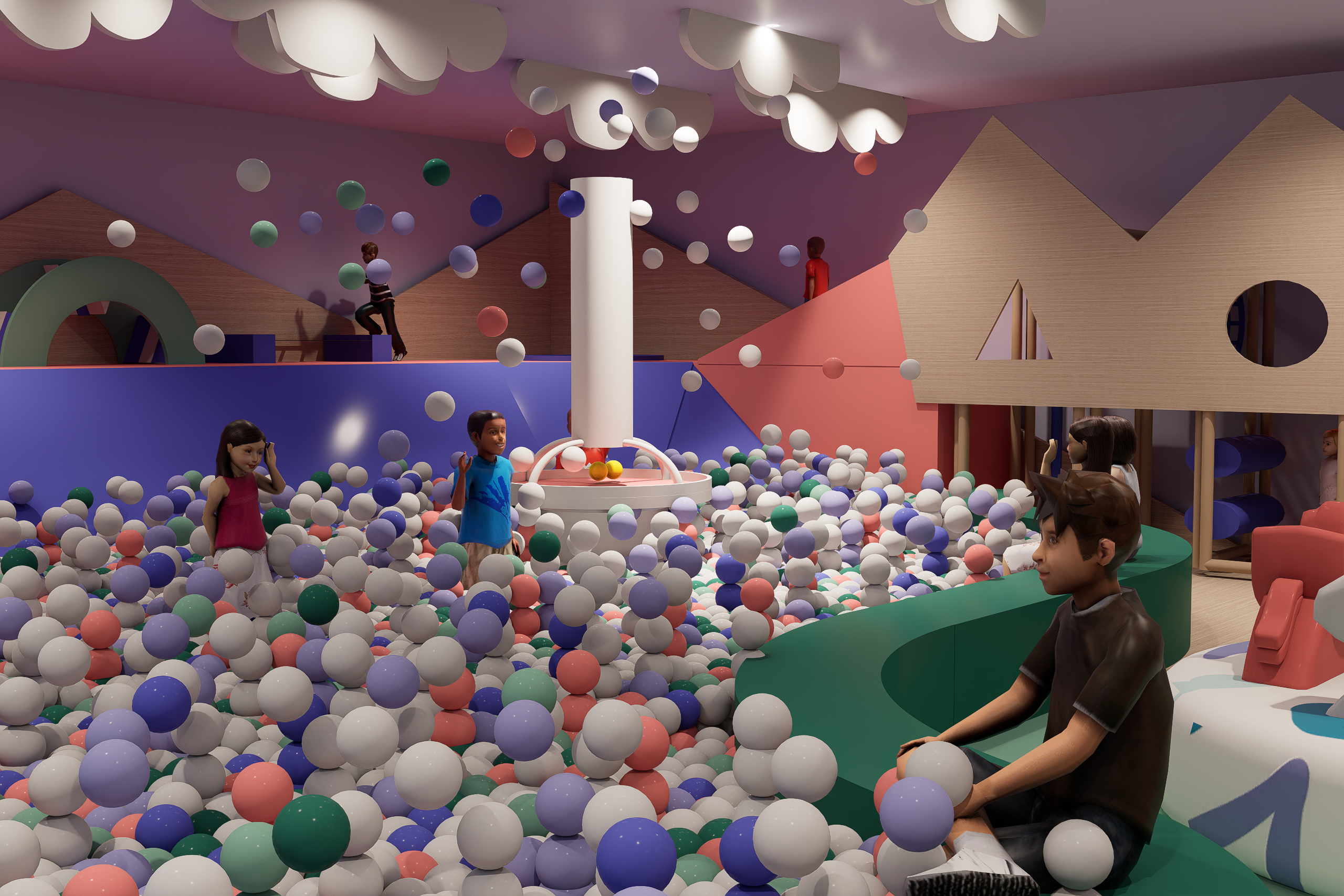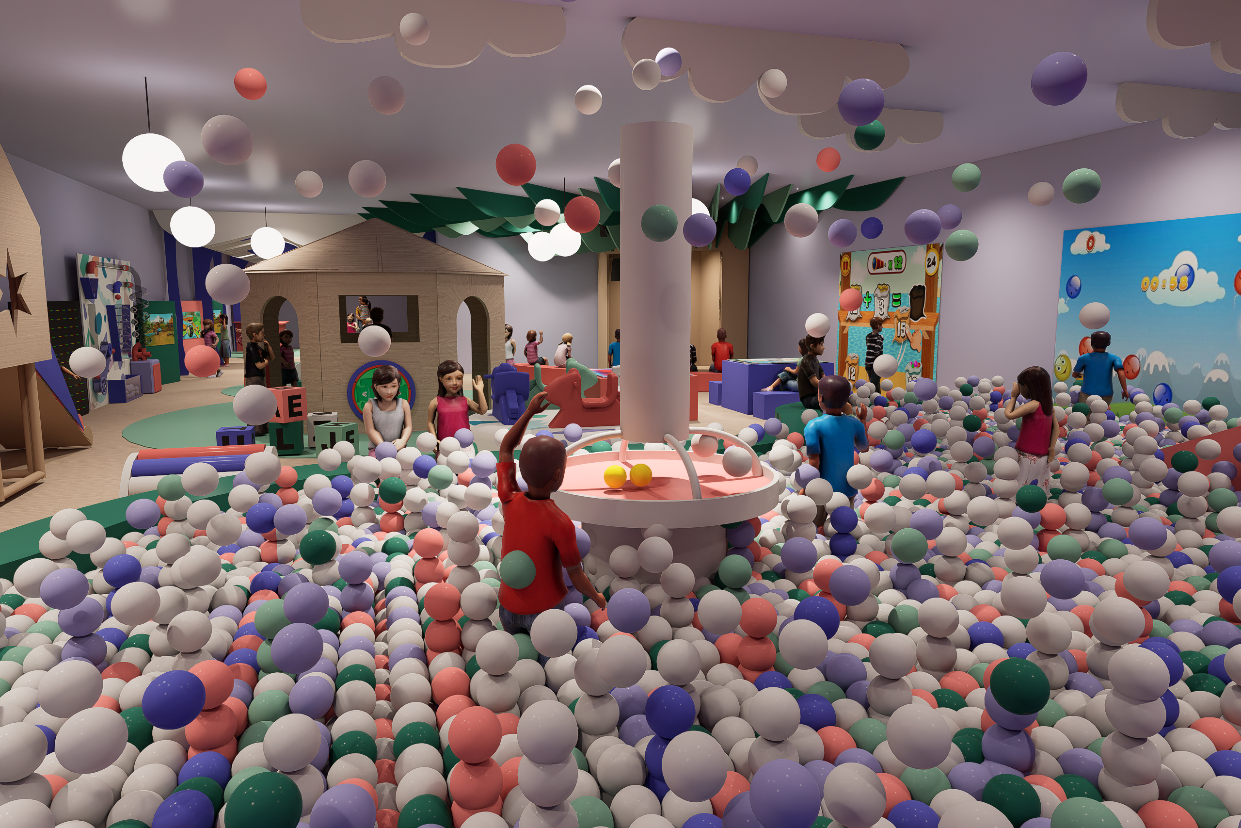 El parque también cuenta con un alegre carrusel, juegos proyectados en paredes y suelo que reaccionan al movimiento y permiten la interacción directa, y diversas estructuras de soft play especialmente pensadas para los más pequeños, ofreciendo un entorno seguro, blando y estimulante.