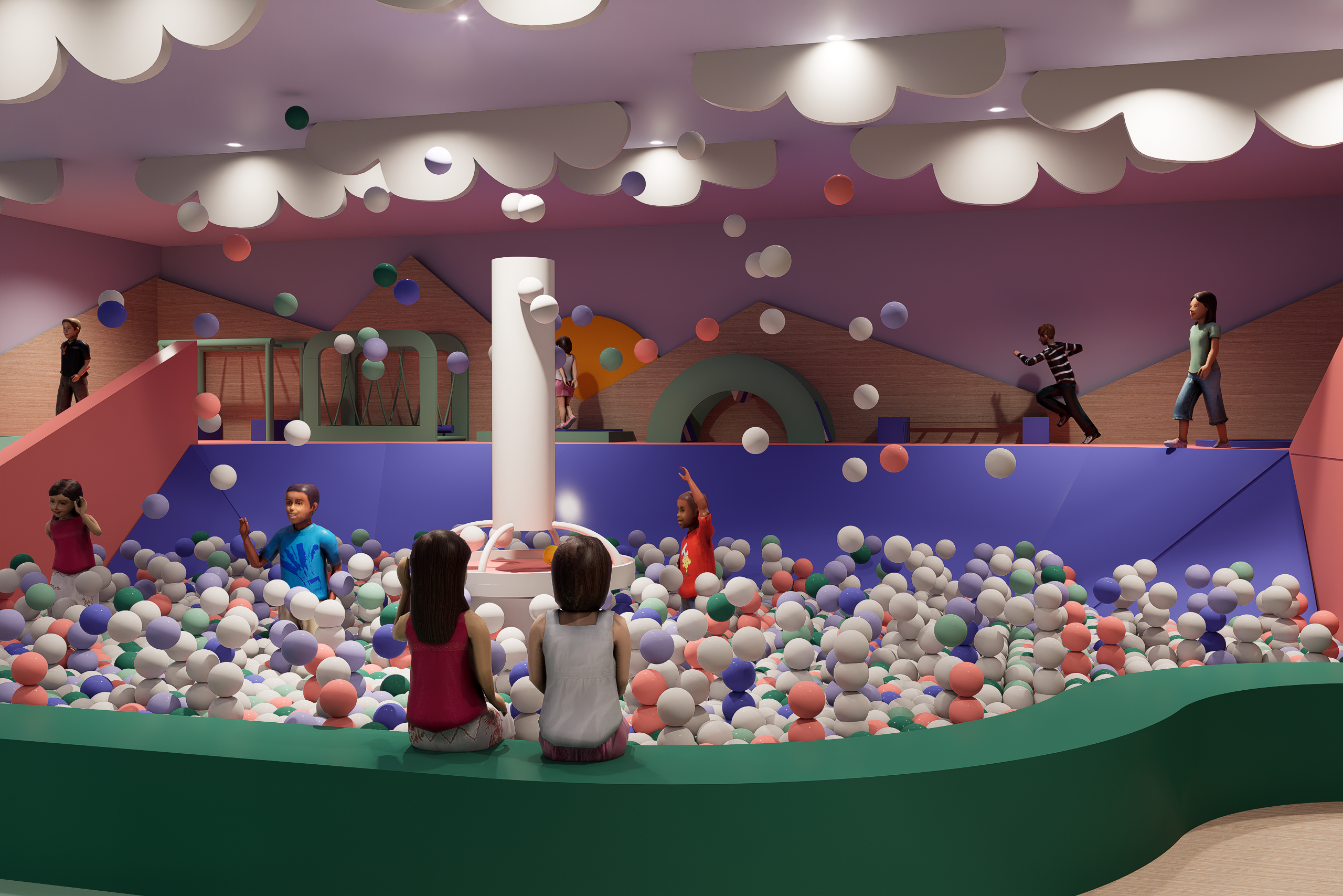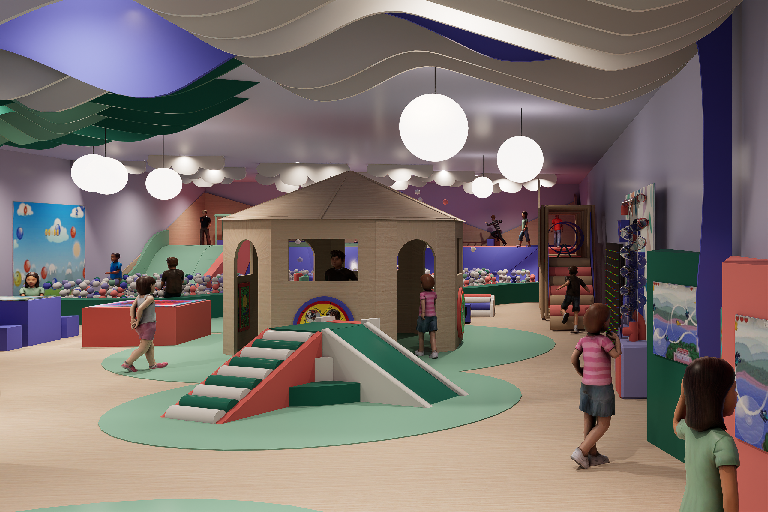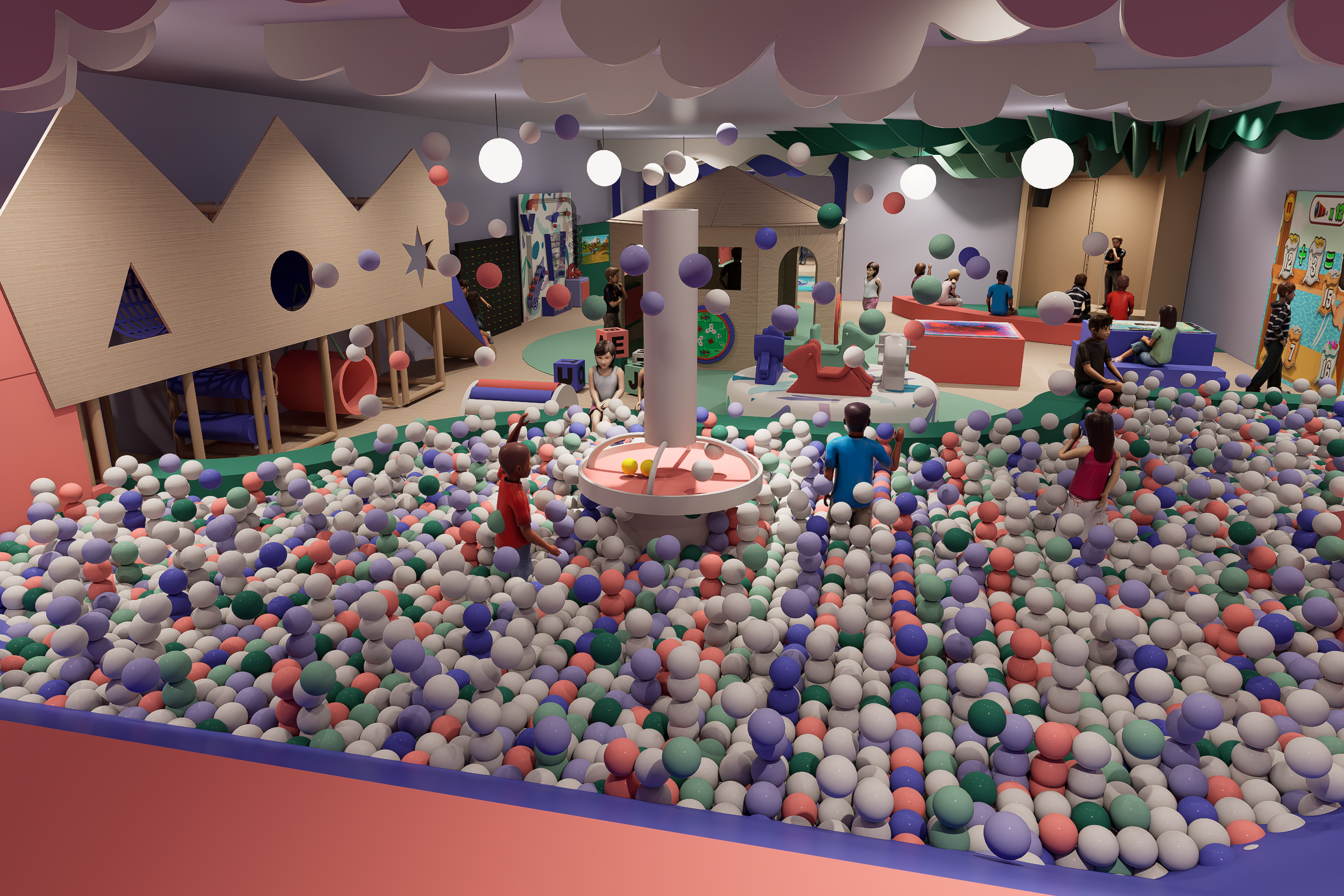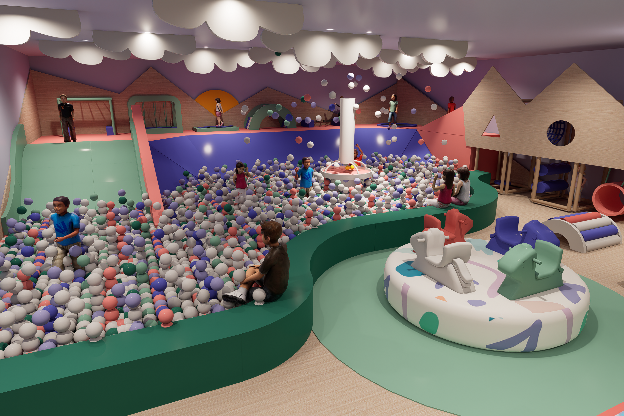 El parque también cuenta con un alegre carrusel, juegos proyectados en paredes y suelo que reaccionan al movimiento y permiten la interacción directa, y diversas estructuras de soft play especialmente pensadas para los más pequeños, ofreciendo un entorno seguro, blando y estimulante.