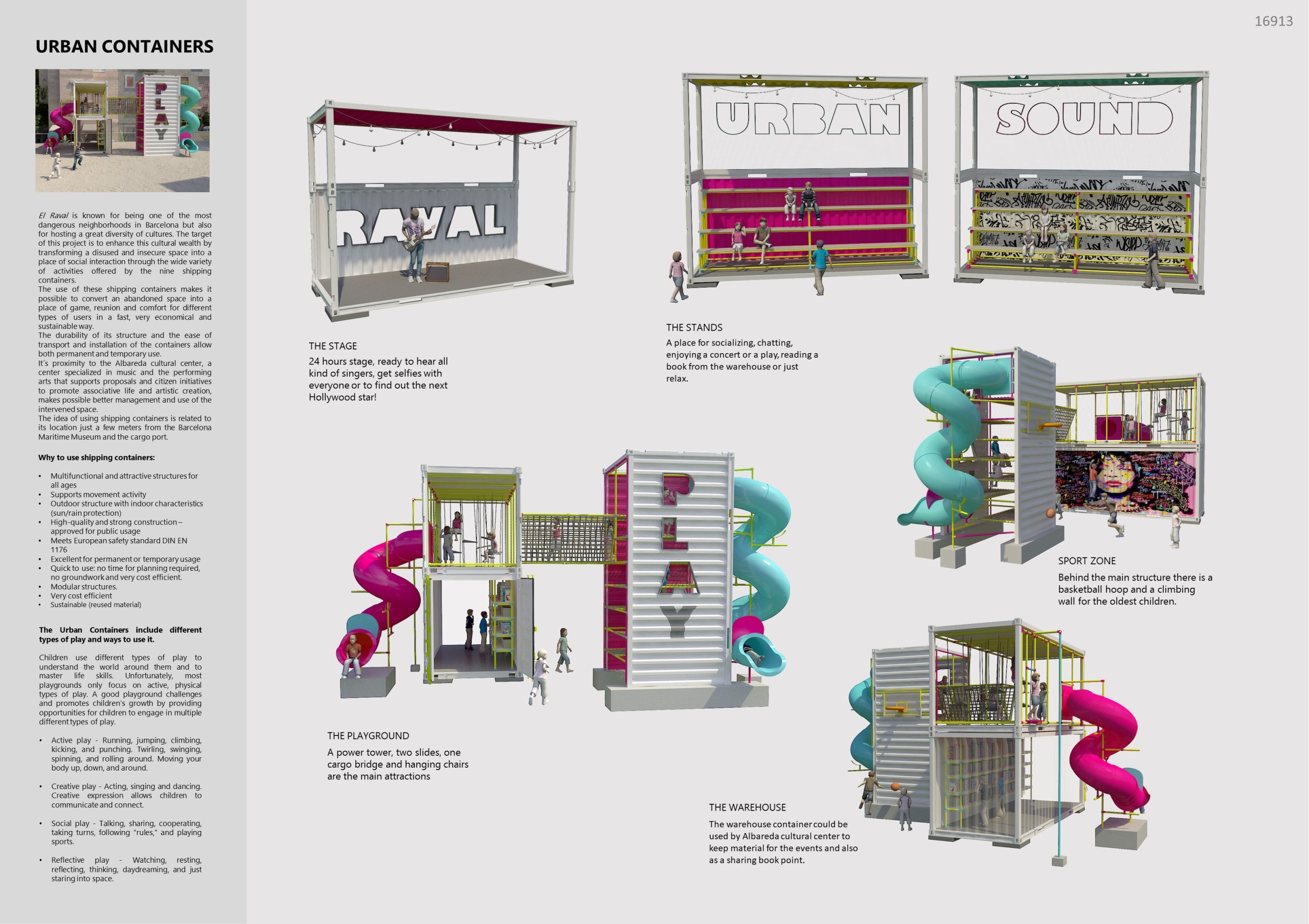 El Raval, uno de los barrios más diversos y culturalmente ricos de Barcelona, también enfrenta problemas de seguridad y espacios en desuso. Este proyecto nace con el objetivo de revitalizar un espacio abandonado a través de la instalación de nueve contenedores marítimos reutilizados, transformándolo en un lugar de interacción social, juego y expresión artística.