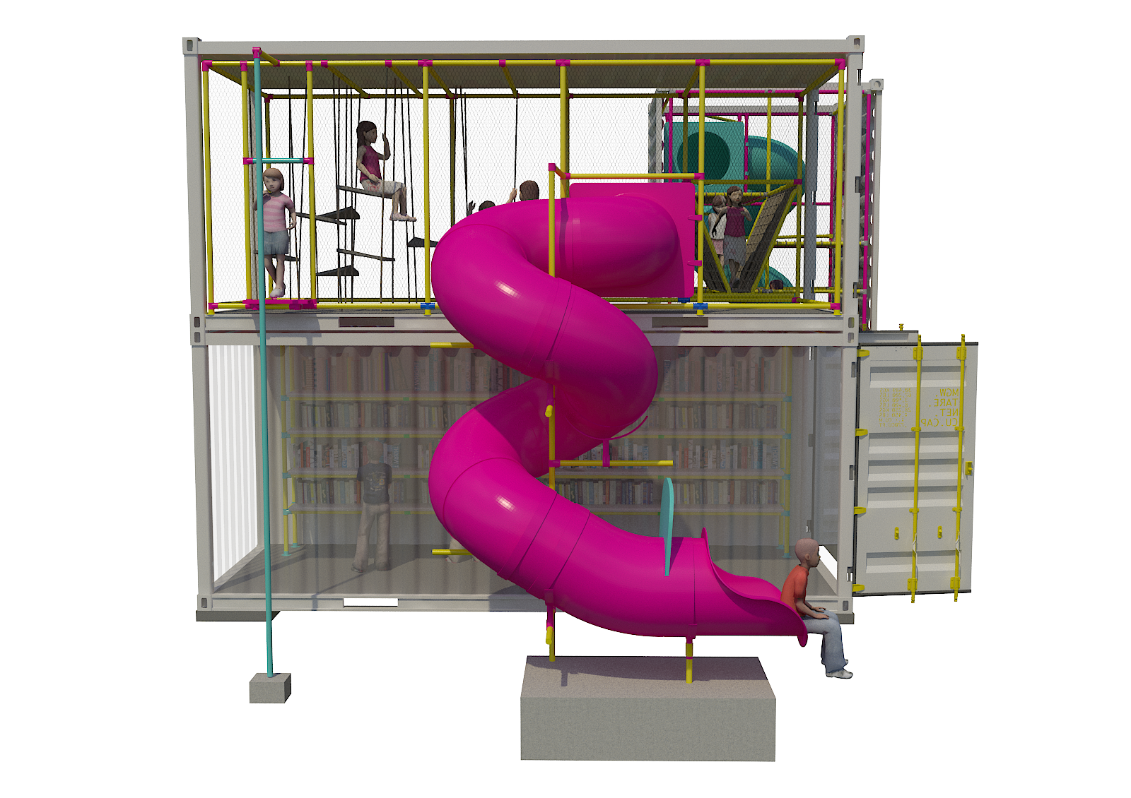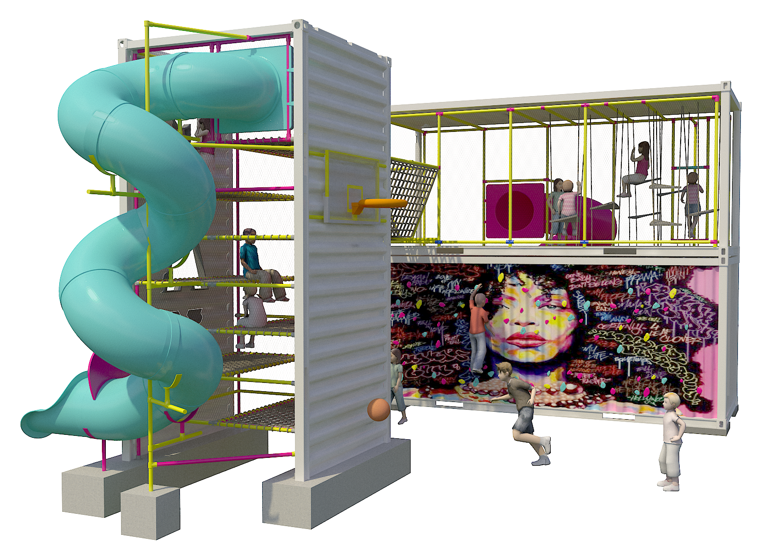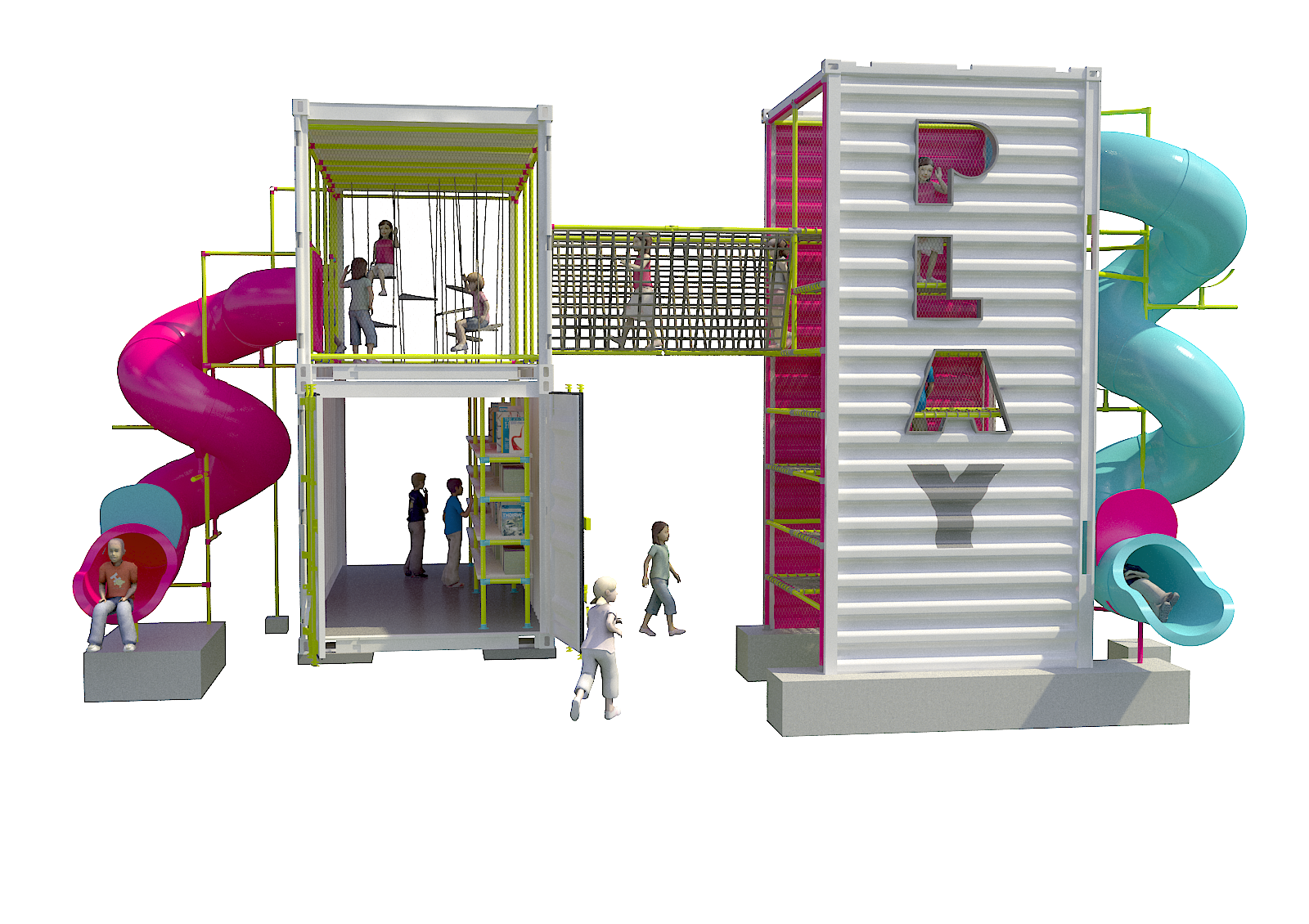 Una estructura central con torres, puentes, toboganes y sillas colgantes que invitan al juego activo, libre y creativo.
